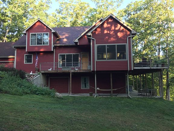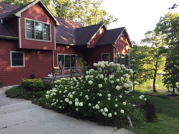 Enjoy the serenity and peacefulness that this 4 bedroom, 3 bath custom lake home has to offer. Located in a quiet cove just off from the main lake at Sundown Lake. You will be amazed at all this location has to offer. Secluded and comfortable This lakehouse property offers a beautiful life lived close to nature but with ample room and amenities for family and friends. A drive across a wildflower meadow takes you down a winding drive to the house which is nestled into the hillside, surrounded by trees overlooking a grassy point on a private cove. A modern house with nature-inspired details This lodge-style open-plan modern home features high ceilings and lots of windows. Solid quarter-sawn oak doors throughout house add to the natural feel. The impressive centerpiece of the living room is a handbuilt fieldstone fireplace. Ceiling fans throughout the house keep air moving. Live life at the water's edge You can't beat a water view. And this house offers 250 feet of shoreline. Sit on the dock and enjoy your morning coffee. If you're a swimmer, you'll enjoy doing laps surrounded by trees in the no-wake cove. If you love to fish, you can simply drop a line off the dock and pull in dinner. Kayakers will find easy access to the lake from your own shore; just slide in a paddle off. And this deep water cove (more than 7 feet deep in the middle) allows easy boat access. Inside this spectacular home, you can see the lake from every room. Enjoy a perch in the trees overlooking the water Grill and dine on the deck overlooking the cove which runs the width of the house and is large enough for grilling and cocktail seating areas as well as a large table to accommodate the whole family and guests. Grow your own herb garden in pots along the deck. Sunny in the morning and shaded in the evening, it allows the perfect setting for coffee, drinks, dinner, and after hours cocktails listening to the whippoorwills calling and toads singing in the cove. Summer brings lightening bugs that light up the night. And if stargazing is your thing, the night sky is filled with constellations because there's no light pollution. If you love wildlife, sitting on this deck is like a being in an IMAX theatre, with birds, such as rose-breasted grosbeaks, purple and gold finches, cardinals, wood peckers, and hummingbirds, flitting back and forth in the trees. The woods below have other interesting inhabitants and you'll frequently see turkeys, foxes, and deer wandering through. The cove has eagles and great blue herons that fish, creating a nature show with no end. Custom touches everywhere This three-story lodge-style home features natural high-end materials: hardwood oak flooring, handmade quartersawn oak woodwork, doors, and staircase, locally sourced rustic beams and mantel, natural fieldstone fireplace with bluestone hearth, custom lighting, and two master suites. This energy efficient home is nestled into the hillside of beautiful oak and hickory trees. Family and friends With 4 bedrooms and some well-placed fold-out couches, this house sleeps 12 in comfort. Here are the stats on this beautiful property: OUTDOORS 5.72 acres of land with wildflower meadow, woods, and waterfront 250 feet of waterfront 32-foot long Roll-a-Dock 6 person Hot Springs Spa Lower garage (perfect to store mowers, kayaks and other toys) Upper 2-car garage Two levels of lake view for entertaining: Upper deck with Weber grill hooked to LP overlooking lake Lower patio with hottub that partially wraps around the house (with hammock area) Natural landscape for low-maintenance easy care Shoreline partially rip rapped with natural field stone Firepit area by water Need more room? There's an RV hookup with electric and water and parking area in the meadow above the house. PLUS: There is plenty of room to add a shed if more storage is needed. INDOORS UPPER LEVEL Master Bedroom 1 Reading nook/office Walk-in closet with wood closet system Vanity with double sinks, granite top, and walk-in shower Tile floor in bathroom Solid Red oak hardwood floors MAIN LEVEL Kitchen/Dining Area 9.5 x 5.5 granite (full single slab) kitchen island with Amish-made quarter-sawn oak cabinetry (Island seats 8) Granite countertops Stainless steel farmhouse sink Stainless appliances Gas cooktop Built-in microwave Hand-crafted Amish kitchen cabinets Pantry Custom light fixtures over island Solid Red oak hardwood floor Solid quarter-sawn doors and trim Living Room Native fieldstone Heatilator fireplace with concrete ram's head (reclaimed from a downtown Chicago building) Local Amish-made oak mantel Bluestone hearth Quarter-sawn oak staircase and trim Red oak hardwood floor Four-season Porch (currently set up with sleeper couch for additional bedroom) Windows showcase views from all directions Solid Red oak hardwood floor Solid quarter sawn oak trim Glass doors Master Bedroom 2 Full bath with tub and vanity sink with granite top Tile floor Solid Red oak hardwood floor Quarter-sawn oak trim and doors Large closet Two-car garage Provides access directly to kitchen Automatic garage door LOWER LEVEL Bedroom 1 (currently with queen bed) Quarter-sawn oak trim and doors Closet Bedroom 2 (currently with queen bed) Quarter-sawn trim and solid oak doors Closet Family Room (currently has two couches, one which is a sleeper couch for additional bedroom) Quarter-sawn oak trim Bathroom Full bath with tub, gorgeous vessel sink, and tile floor Quarter-sawn oak trim and door Laundry Room Washer and dryer Quarter-sawn oak trim and doors Workshop Large enough for any project or storage Lower garage For lawn equipment and winter storage Automatic garage door Additional Property details Local Amish-made oak beams throughout two upper levels Pella windows and doors throughout entire home Lennox LP gas furnace Sump pump Hot Springs Spa Wooden topped Roll-a-Dock with swim platform