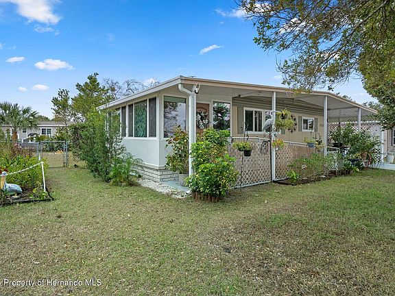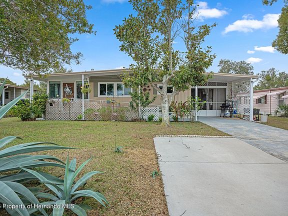 Active with Contract Motivated Sellers! Very Well PRICED! Wow!. HOA FEES All paid through 12-31-2025. Ask your Realtor. Welcome to the vibrant & active 55+ 24x7 gated community of Brookridge-where you can enjoy a wealth of amenities including golf, tennis, bocce ball, shuffleboard, swimming, and a variety of clubs to stay as active as you like. Make new friends and enjoy all Brookridge offers. Located close to shopping, new restaurants and an amazing choice of dining all nearby. Tampa General & HCA hospitals close by with supportive medical facilities convenient to the community. You're going to love this charming and lovingly updated 2 bedroom and 2 bath home with very spacious fenced back yard, 2 storage/shop buildings, Screened lanai, and carport all with just under 1240 square feet heated and cooled living. Enjoy the utility costs savings with the new energy efficient windows installed in 2018. Entering through the carport area into the very nicely updated tiled kitchen and dining area with wood laminate floor for easy cleanup! LED lighting showcases the new cabinetry and gleaming stainless-steel appliances. Very nice space for enjoying preparation of your meals. Living room bright and light with French doors leading out to the enclosed carpeted Florida Room set up with heating and cooling. Door leads to an accessibility ramp which may be removed if not needed. Primary Bedroom with ensuite bath is freshly carpeted and open to a spacious shower bath with update vanity, new toilet and Luxury vinyl tile floors. 2nd bedroom is light and bright with laminate floors and walk in closet. Outside you will find the following extras: Screened area of carport perfect for outdoor living, which includes laundry & utility storage, hot water heater 8-2024, water filtration system-installed 8-24. 8x16 Storage shed and 2nd shed perfect for workshop or hobby shed. A 50-amp generator connection is available. Back yard is fully fenced, perfect for your pets. Driveway has extra parking pad included. Ideally located less than 10 minutes to Hwy 589 which takes you to the Tampa Bay International airport and the beaches. Make this beauty yours this spring! Financing is available. Please ask for additional list of amenities and exclusions.