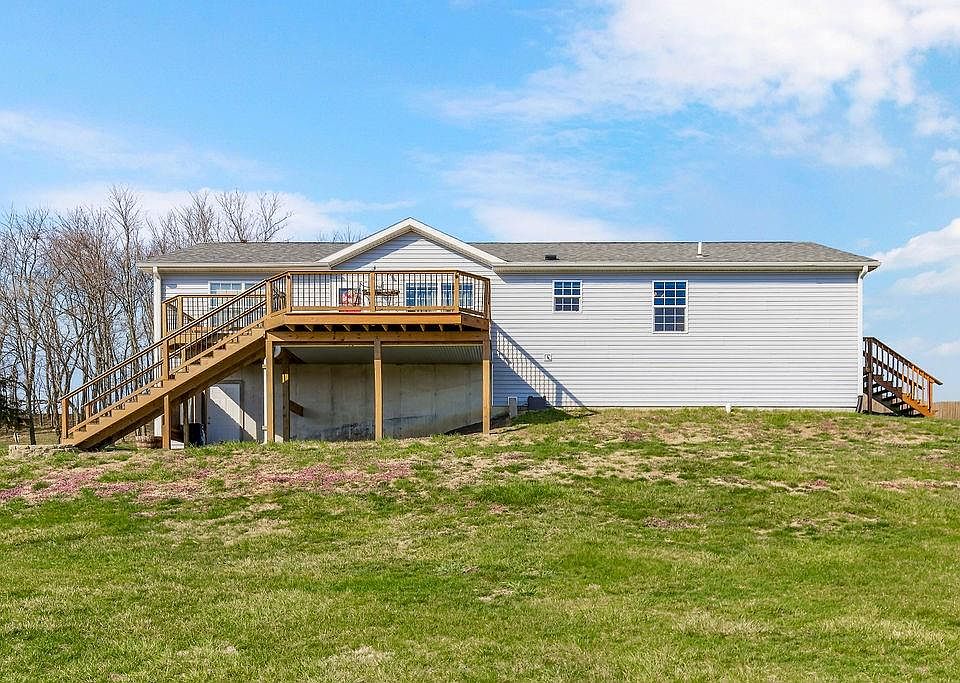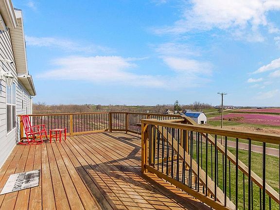 Charming Raised ranch home on acreage in De Kalb! Walk up to the huge front deck with a beautiful view, making the perfect place to entertain guests. Right inside is the spacious living room gleaming new floors. The kitchen is newly remodeled with new flooring, new stainless steel appliances, a new farm sink, and features an island and a shiplap accent wall in the eat-in area. The primary bedroom features a primary bath with a double vanity, and a large walk in closet. 2 more large bedrooms upstairs. The finished basement has two non-conforming bedrooms and the laundry room. The large fenced in backyard is flat and fenced with a another large deck, perfect for kids and pets! This home and its view is as peaceful as it gets!
