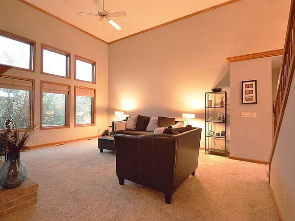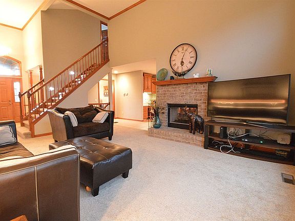 If you're looking for space to entertain this home has it. Large 1/2 acre lot on Cul-De-Sac in the prestigious Lionsgate Passage in Leo! 5 bedrooms, 3.5 baths on full finished basement. Master suite on the main floor with private bath, double vanity, jet tub, separate shower and walk in closet. Large two story living room with wall of windows for nice natural lighting, two way fireplace opens to the breakfast area and kitchen. Kitchen features newer stainless appliances that will stay with the home and corner pantry. Laundry and half bath are just off the kitchen that lead out to the large 3 car garage with utility sink and extra storage above. There is a formal dining room off the kitchen that could also make a great office space. 3 additional bedrooms and full bath upstairs. 5th bedroom is in the basement along with an additional play room, wet bar with mini fridge, and a huge rec room! All new carpet through out. There is also a deck out back great for entertaining in the large backyard. Part of the house is wired for surround sound. Seller has original blue prints for new home owner.