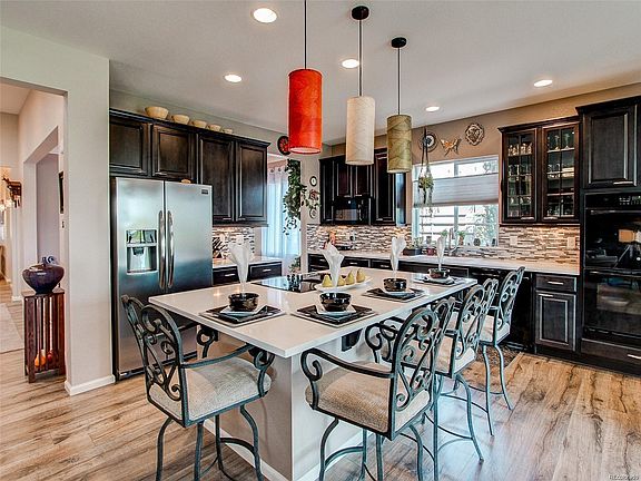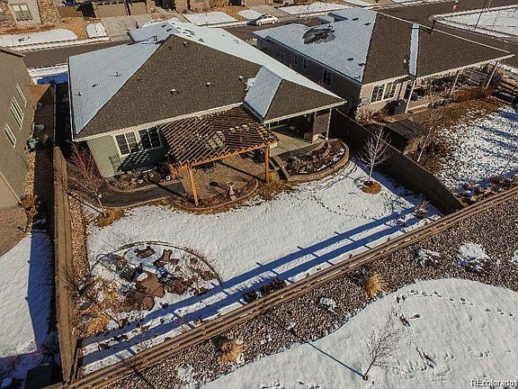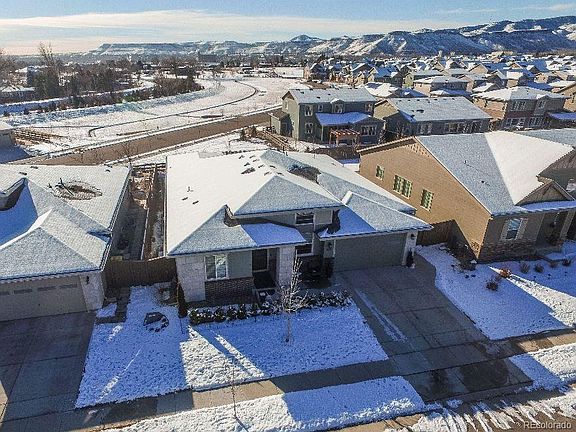 Beautiful ranch style home, "Highlight model" with unobstructed views of S. Table Mtn and backs to maintained green space. Tasteful updates/upgrades throughout: pan ceilings, crown molding, engineered hand-scraped wood floors, quartz counters, full tile back splash, wireless access point, surround sound, additional electrical outlets, larger AC, widened concrete sidewalk for access to back yard. Dual electrical panels - one in basement, additional lighting. The yard is a gorgeous sanctuary with a covered patio, roof line height pergola, paths, perennials. Unfinished basement with upgrade 9' ceilings, egress windows, rough in, built-in radon system. Easy access to the mountains, I-70, Downtown Golden, Olde Town Arvada. Low HOA dues cover many amenities-playground and community pool. New Terrain Brewery only 1 mile from neighborhood. Pre-school and elementary school within a short walking distance!