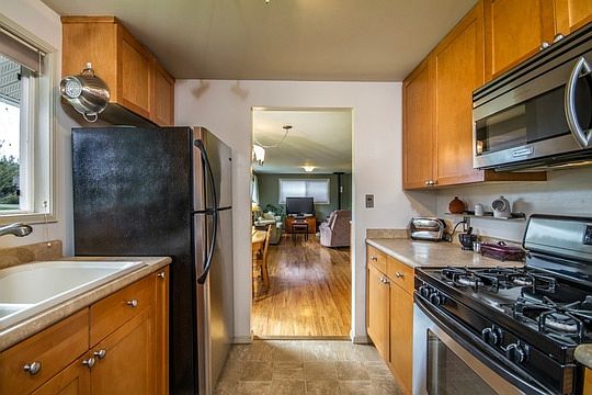 Meticulously maintained single level home restored and updated! Brand new kitchen w/built-in buffet, modern appliances, original hardwood floors refinished throughout, and a cozy gas fireplace in the living room. Entertain in the amazing backyard oasis- completely fenced, 60 x 20 custom patio of pavers with inset design, large lawn, fruit trees, horseshoe pit and brand new detached shop also featuring a custom designed paver floor, power and plumbed for future water hook-up. Convenient location!