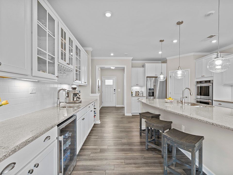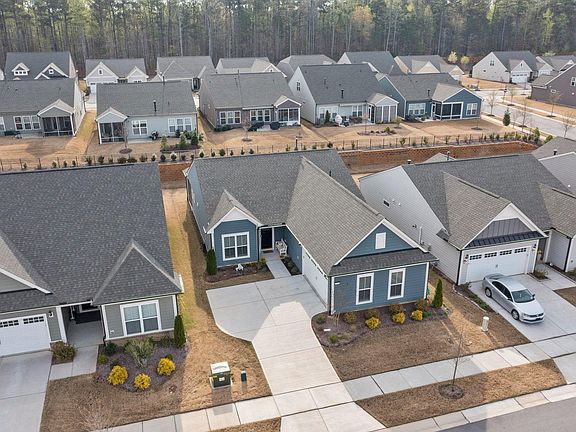 Experience the benefits of low maintenance living in this beautiful, freshly painted, ready to move-in home in Del Webb at Traditions in Wake Forest! The Castlerock plan offers 2 bedrooms, 2 full baths PLUS an office/flex room. This bright & cheerful home has a gorgeous upgraded gourmet kitchen featuring large island, granite countertops, white custom cabinetry, recessed lighting, wet bar w/wine fridge, Kitchen Aid stainless steel appliances, double wall oven & walk-in pantry. Enjoy coffee & relaxing outdoors on the screen porch or patio. The oversized garage provides room for your golf cart, or workshop & there is an additional 370 sq. ft of unfinished space for room to expand or more storage! Active adult (55+community) offers yard maintenance, fabulous amenities with walking trails, pickleball, indoor pool, clubhouse with tons of clubs & activities. Don't miss this opportunity to be in a great community less than 3 miles from downtown Wake Forest, NC!
