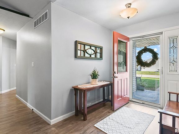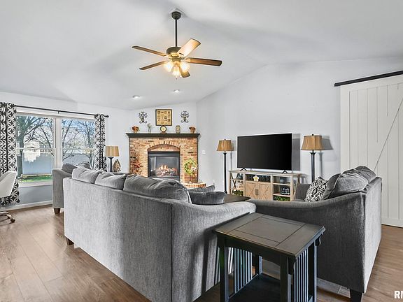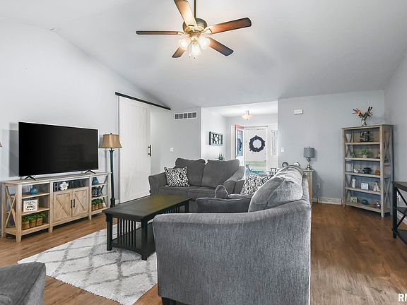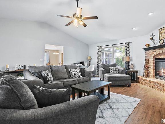Very nice home in popular Oakbrook Estates. Expansive kitchen with solid surface counters with integrated sink and an abundance of cabinets. Front door opens to cozy foyer, vaulted living room with vinyl plank flooring & corner gas fireplace. Down the hall, which can be closed off with sliding barn door, are 3 bedrooms including large primary suite with dual vanities & walk-in closet. Nice laundry room/drop zone & half-bath from the garage entrance. Great to have extras - Wonderful 3 season 15 x 15 sunroom addition off kitchen with vinyl windows. There is even a storm shelter built into the garage! Nicely landscaped, fenced yard with cute shed that can also be a playhouse. Preinspected, repairs made, selling as reported. Hurry - this one won't last!
