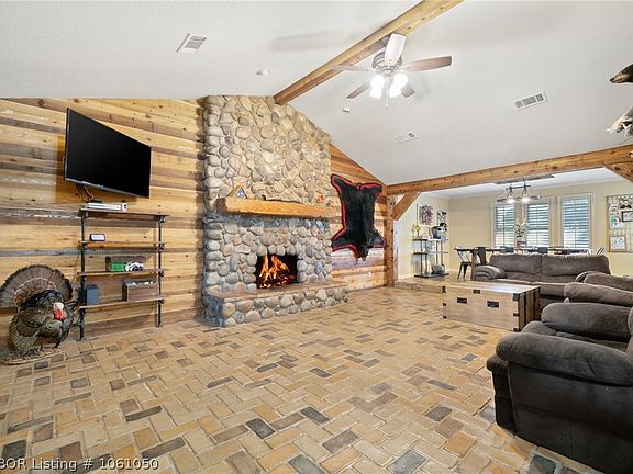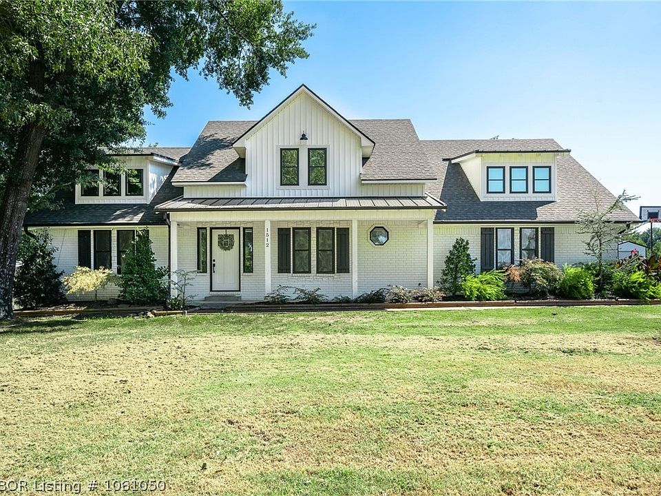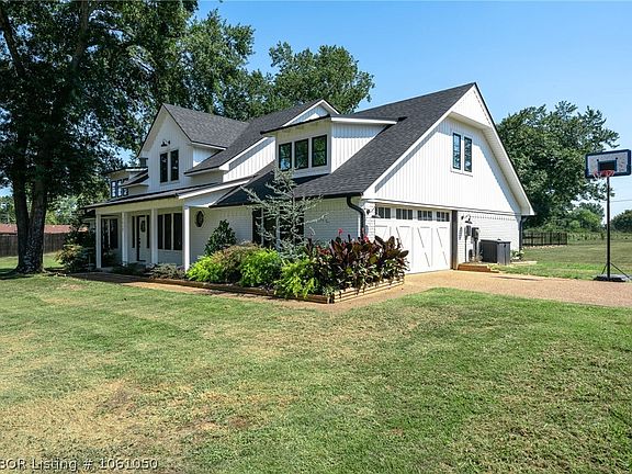 Get ready to be "WOWED" the minute you enter through the iron gates of this park-like 4.26-acre property and head up the drive towards this beautifully designed modern farmhouse. Once inside you will be met with the perfect balance of modern and rustic charm throughout. From the gorgeous river rock fireplace, timber framed doorways to the kitchen's antiqued cabinetry, granite countertops, and stainless appliances. The main level features 2.5 bathrooms and 2 bedrooms one of which is a spacious master with a large ensuite complete with a unique free-standing copper bathtub. Upstairs is made up of a large bedroom with its own full bath. The great features don't stop there. Back outside there is an inground storm cellar, new metal 18 x 30 shop, and a wonderful covered patio that leads to the pool area perfect for those summer days. This home is only 15 quick minutes from Fort Smith and all its amenities.