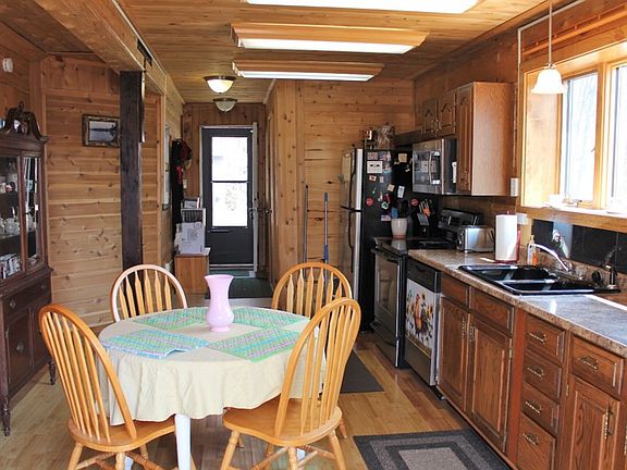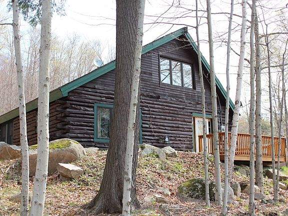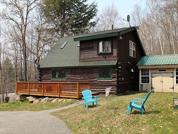 Between the Lakes – 2 bedrooms w/attached full baths plus open sleeping area with vaulted ceilings and skylights, sauna, pantry, propane stove with stone hearth, large deck, new windows, and natural wood throughout. Situated on a double lot with seasonal views of Owl's Head Mt, wildflowers, just over a mile to Long Lake beach, and under a mile to Lake Eaton Beach.