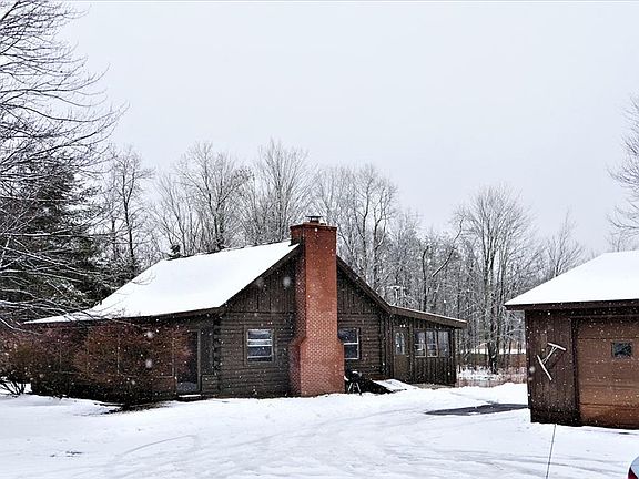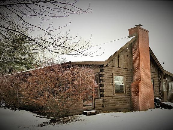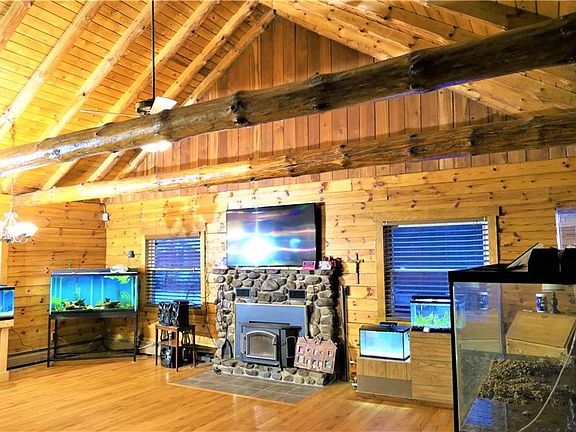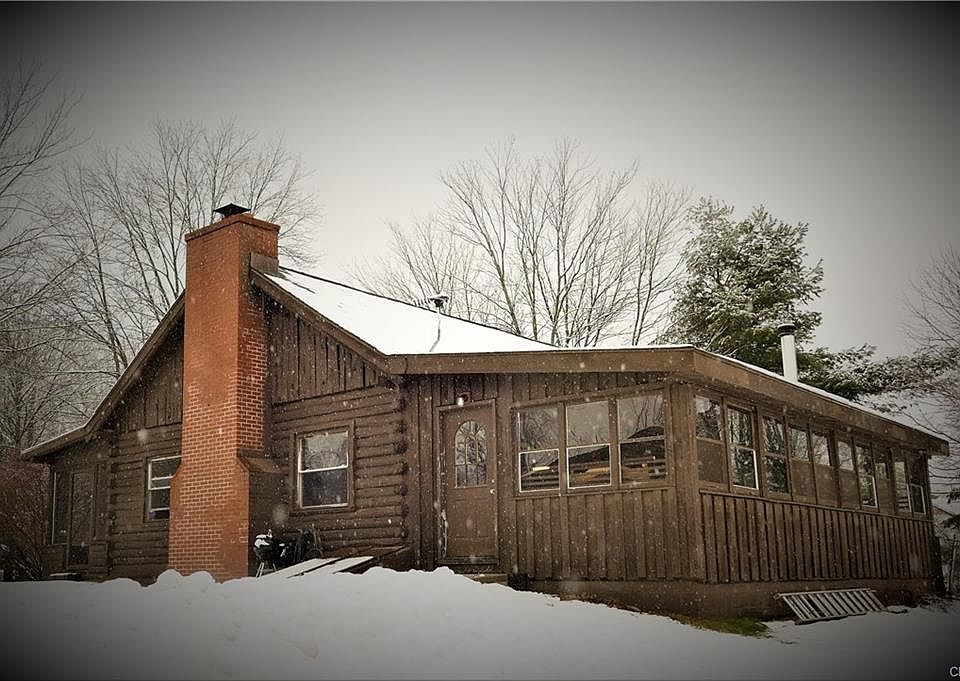 Your own Ponderosa! Real Log Home sitting on its own fishing pond and twelve acres of forests! The rustic home boasts two fully enclosed porches. HUGE Back porch with a real wood burning stove that heats the entire room. The Huge back porch boasts a row of windows from one end to the other facing the pond. Relax by the fire and enjoy nature. Enter the Home and marvel at the cathedral ceilings and log beams all focusing on the Fireplace. There is a loft also facing the Open Cathedral log room. The Master Bedroom is very large and freshly painted. It has french doors to outdoors and cathedral ceilings too. There is a small bedroom and one bath. City Water, Gas, and minutes from Walmart and I-81. Quick commute to Syracuse and Oneida lake is One Exit away. Canada just an hour and half away.