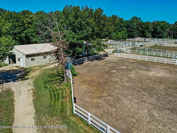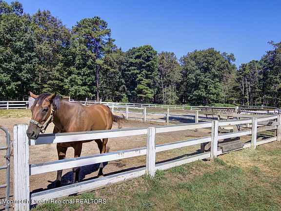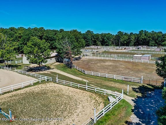 17 Acre horse farm with 5000sf+ spacious home nestled in the pristine Pinelands of Barnegat NJ and less than a 15 minute drive to the beach. Farm includes a 16 stall barn, Riding Trails, 14 Turn-out paddocks, Riding Rings, bleachers, mounting block, sheds with fenced pastures, extensive fencing, round pen for lessons, duck pond and wooded areas. Comfortable custom center hall 4/5BR 4 1/2 bath home w/2 fireplaces, a wood stove & attached 3 car garage. 2 other garages. 1st floor master bedroom suite w/3 bay window & window seat. Master bath w/dual vanities, soaking tub & shower. Formal living rm w/wet bar. Kitchen w/center island & breakfast nook. Great room w/french doors to deck & patio. Formal dining room. 2nd floor boasts solarium room w/hot tub & rec room w/fireplace & pool table.