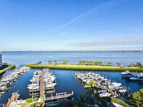 Sitting High Above The Caloosahatchee River ~ The Penthouse View is Spectacular! This riverfront residence offers stunning views and sunsets from the 8th floor. The Great Room arrangement complete with a panoramic backdrop of the marina and river provides an open floor arrangement which includes a great room, spacious kitchen, dining, large master suite ~ All of which open to the river front lanai. The lanai is surrounded with wind rated glass windows allowing for all-weather living. In addition, there are 2 guest rooms; one an en-suite and the other currently serves as a den + a half bath. The guest rooms are connected by a back lanai also enclosed with impact windows and boasting great water views. Appointments to the residence include; tray ceilings, crown molding, plantation shutters, custom window coverings, solid surface counters, all addressed by a grand foyer from a secured elevator. The condo residence is being offered partially furnished, with an under building parking space + storage closet. Harbour Isle offers many amenities; Marina, pool /hot tub, fitness, fishing pier, tennis courts, and more. A 1 car detached garage will convey with the purchase of the condo.