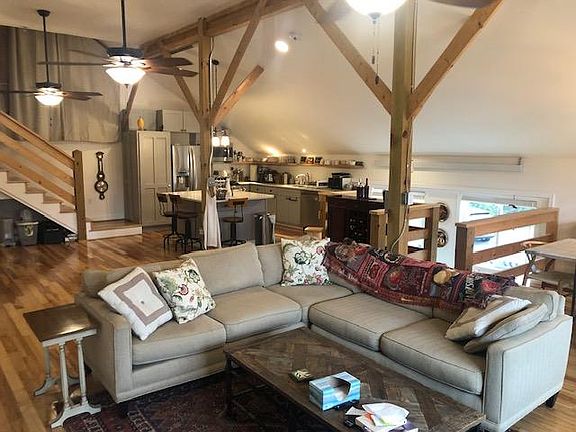 Gorgeous apartment on the second floor of a barn. The apartment sits in a quiet farm setting. It features two bedrooms, one full bathroom, a loft that could be used as a third bedroom, a washer and dryer, and a huge open living room, dining room, and kitchen. In addition to the stainless steel washer and dryer, other appliances include a quiet stainless steel dishwasher, refrigerator, oven/range, and microwave/convection oven. The tenant pays for electricity and Internet. The barn roof is home to 40 solar panels, so this drives down the typical monthly electric bill to anywhere from $10 to $30 (not a promise though...depends on your usage). The Internet charge is $40/month. - The apartment sewage goes into a septic system, so only toilet paper can be put into the toilet. Nothing else goes into the toilet. - Because of the septic system, the kitchen sink garbage disposal is not used. Instead, food scraps are either thrown away or, if they don't include citrus or animal products, deposited into a bin to be composted. - The owner will thoroughly demonstrate how to use and maintain the pellet stove before the tenant may use it. - Tenants who have small dogs should keep their nails trimmed to protect the floors.