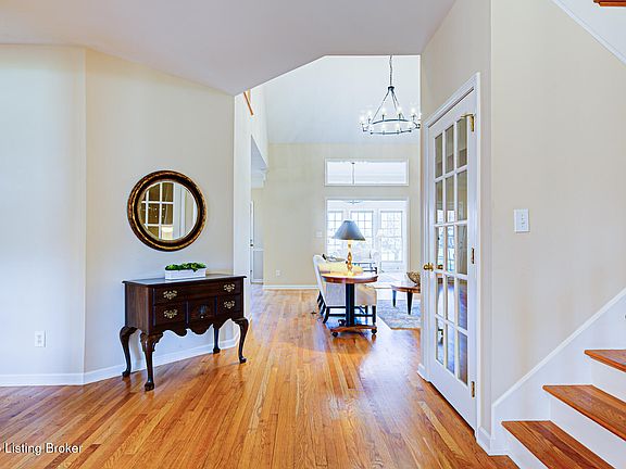 Welcome to 15121 Abington Ridge Place, a beautifully designed home offering the perfect blend of elegance, comfort, and golf course views. From the moment you step into the impressive two-story foyer, you are greeted with natural light and a sense of spaciousness that flows throughout the open floorplan. Gleaming hardwood floors span the main level, adding warmth and sophistication to every room. Just off the foyer, a conveniently located half bath provides the perfect space for guests. The formal dining room is ideal for gatherings and special occasions, while the eat-in kitchen opens seamlessly to the great room, creating the true heart of the home. The two-story great room is anchored by a gas fireplace with custom built-ins, while the adjoining sunroom provides year-round enjoyment, filling the home with natural light and showcasing stunning views of the golf course. The first floor also features a spacious primary suite, designed as a private retreat with serene views of the golf course. The primary bath is complete with a vanity featuring dual sinks, a separate tub, and a tiled shower. A first-floor laundry room adds everyday convenience. Upstairs, you will find three comfortable bedrooms and two full bathrooms, offering ample room for family or guests. The finished lower level expands the living space even further with a large common area perfect for gatherings or a family room, plenty of additional storage, and a full bathroom. Outdoor living is equally inviting with a patio overlooking the golf course, creating the perfect setting for relaxation or dining outdoors. A two-car garage adds storage and functionality, while updated lighting throughout the home brings a fresh, modern touch. As a resident of Lake Forest, you will enjoy resort-style amenities including multiple pools, tennis courts, outdoor recreation areas, a soccer field, volleyball courts, nature trails, and a private clubhouse, along with optional golf or social memberships. The home's location also offers convenience with nearby shopping, dining, the recently built Publix, and easy access to I-265. This stunning property combines open living, elegant design, and exceptional community amenities, making 15121 Abington Ridge Place a home you won't want to miss.
