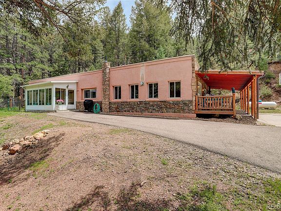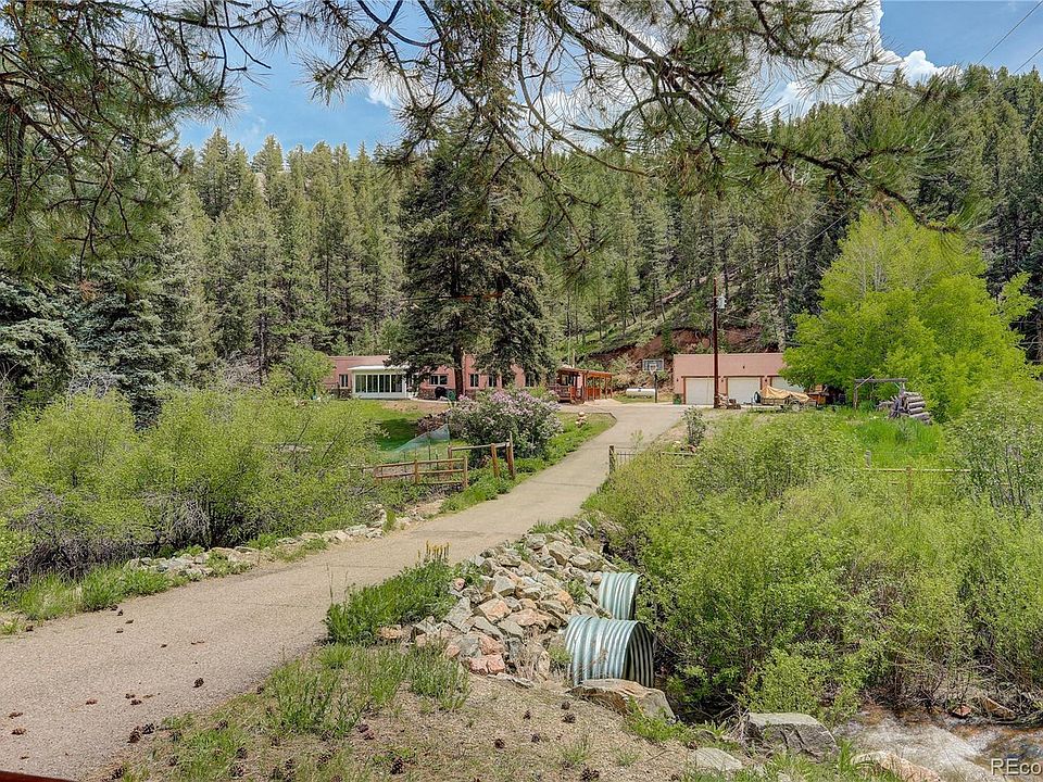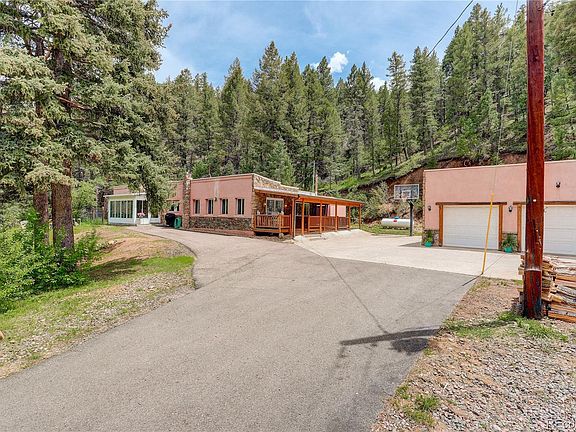 Secluded RIVER front retreat with amazing views! Listen to the river as you relax and watch the stars. Cross your own private bridge to flat land with a multitude of uses! Towering pines & aspens & wildlife abound! Huge 3 car garage & workshop with separate electric to run a private business from or for your hobbies. A few land amenities include fenced property, separate fenced dog yard, full size basketball court, Green house and garden are set in very rich soil and is very prolific, original well house, 800 ft new well, plenty of parking, no HOA! This ranch style home offers main level living with a complete no stairs option and is a unique combination of quintessential mountain charm and modern updates. The interior is wrapped in gorgeous knotty pine, wood floors, efficient wood burning fireplace. Unique bonus spaces including an office, second family room, sun room and one of a kind extended breezeway along the entire back of the house! The home boasts updates such as new septic system in 1997, all electrical, including new electric panel and plumbing in 1997. Only 7 minutes to 285 and all of Conifer amenities! Award winning Jeffco Schools! Come see this piece of paradise!