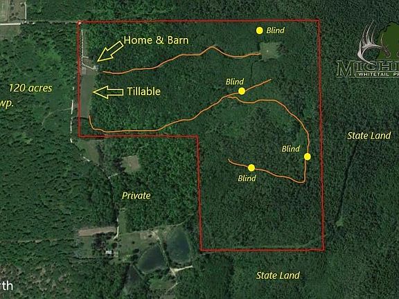 Here is your year round Northeast Michigan getaway!! This 3 bedroom 2 bath Alpena County home sits on 120 thick dense acre's. It comes equip with back up generator that automatically comes on when the power is out. There is a 28'x42' pole barn. A portion of the barn is sectioned off into a heated, air conditioned,insulated man cave. Next to the house is approximately 1.5 acres of tillable with a small area fenced off for a garden. There are a couple trails to get around the property and to give access to the hunting blinds. Over the years there have been some fantastic bucks taken off this property. Along the eastern border and half of the southern border are thousands of acres of hard to access public land. There is some agriculture in the area to help keep the deer well fed.