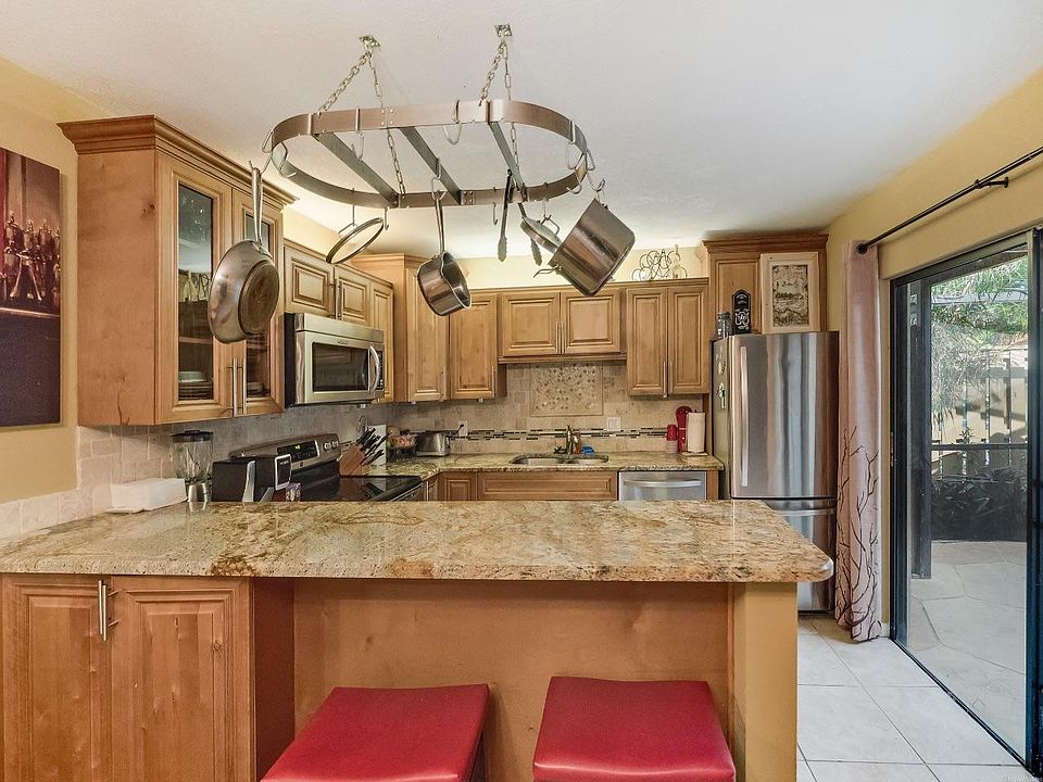 Don't Miss Out! Priced To Sell Fast!!This Fully Remodeled 2 Bedroom 2 1/2 Bath Home Has Great Patio Area! The Many Upgrades Include Gorgeous Kitchen w/ Stainless Steel Appliances & Granite, 3 Custom Designed Bathrooms, Roof, AC Unit, Washer & Dryer, Tile & Wood Floors. You Will Enjoy The Large Screened Patio Off Family Room & Kitchen w/ Retractable Awning, Balconies Off Both Bedrooms. Gas Water Heater, Fireplace, Washer & Dryer. This Community Is In The Heart of PBG w/Low HOA Fees. Community Center Down Street Has Aquatic Center, Splash Park, Walking Trails & Much More. **Bougainvillea On Patio Was Removed After Photo Taken.