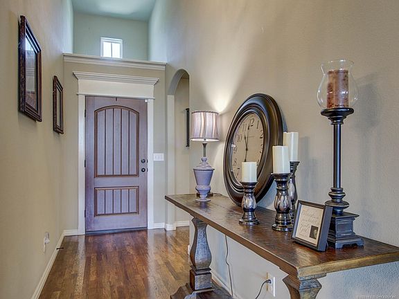 Beautiful 1 story home located in Seven Oaks South in Broken Arrow. Open floor plan showcases impressive high ceilings that welcome you home! Oversized garage, covered patio, hardwoods, formal dining, granite counters and a neighborhood pool. Large master bedroom includes his/her vanities and a grand walk in closet. This one won't last long, schedule a showing today.