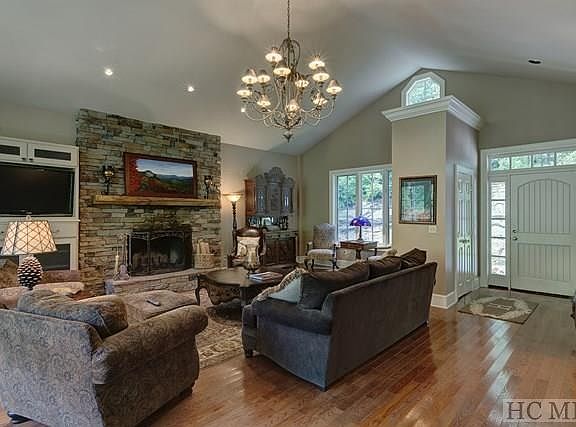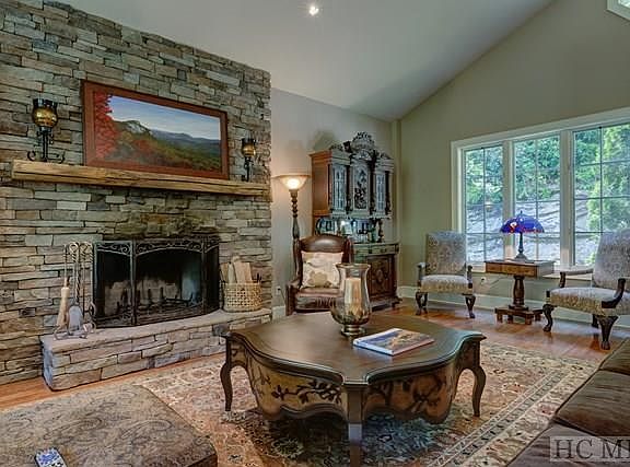 A RARE OPPORTUNITY TO OWN THIS STUNNING, NEWLY RENOVATED HOME LOCATED WITHIN THE GATES OF HIGHLAND FALLS COUNTRY CLUB, AND JUST MINUTES AWAY FROM THE HISTORIC DOWNTOWN HIGHLANDS MAIN STREET! Highlighted upgrades include a new kitchen on both the main and lower level, Trex decking on all exposed porches and gateways, encapsulation of the crawlspace, plus a newly repaved driveway. As you enter the spacious great room on the main level, you are welcomed with a large stone fireplace, wood floors, cathedral ceilings, a screened-in porch all with a wonderful view of the Cullasaja Ridge. The main level floor plan is ‘open’ providing a smooth flow to the new kitchen and dining area. The main level also sports a large primary suite, with a private deck, his and hers walk-in closets, his and her vanities, a spa tub with high-end brass fixtures in the bath area. The lower level is ideal for guests as it offers two lovely guest suites, an office, its own great room with fireplace, kitchen, and a covered deck again with a view of the Cullasaja Ridge. The home has a spacious 2-car attached garage, mudroom/laundry room entry from the garage, plus a separate golf cart garage. For those that qualify, this home uniquely comes with a $490,000 loan at a fixed rate of 2.125% through January 2031- a $100k value in today’s market. Golf or social memberships in HFCC are optional. This home is being sold on a furnished basis - it is move-in ready. Don't miss out on this special home in this special place! [Note #1: Seller will pay a buyer’s agent fee of 2.5%] [Note #2: the pictures of the kitchen on the main level do not show the 48” new Viking refrigerator to be delivered/installed by June 30th].