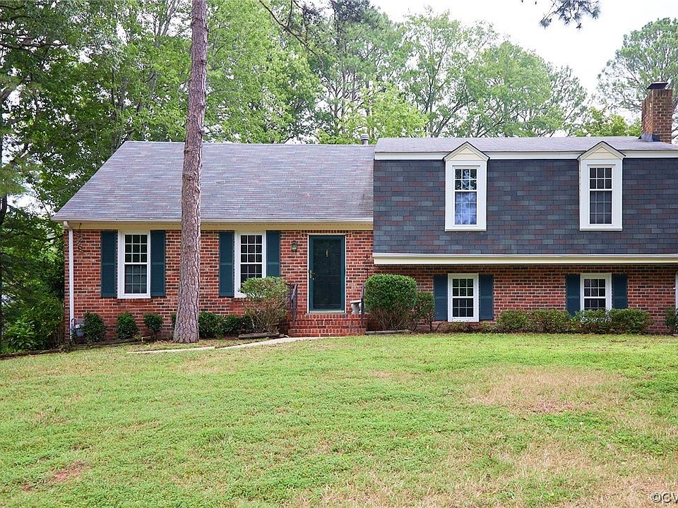Nestled on quiet Jonquill Dr, you'll find this 3 bedroom, 2.5 bath brick tri-level in the much-loved neighborhood of Canterbury. *WALKABLE TO GODWIN* More than 2,000 sqft & room to easily expand. The thoughtfully refreshed kitchen (2023) has GRANITE countertops, stainless steel sink, a chic pull-down faucet, soft, green cabinets w/ gold accents & NEW LVP FLOORS. FRESH PAINT & REPLACEMENT WINDOWS make the home bright and airy. The downstairs den's got mid-century vibes, with rich paneling, a show-stopping brick fireplace, built-in bookcase & bar w/ motion sensor light, plus soft, neutral carpet. Perfect for your big TV & gaming system. Upstairs: a primary ensuite that EASILY FITS YOUR KING BED, & 2 good-sized bedrooms, 2 FULL BATHS, & approx. 350 sqft of roughed-in attic space w/ LOTS OF POTENTIAL! Large walk-out basement w/ oodles of storage PLUS space for your hobbies. ROOF (2013); HWH (2018) Elevated lot | almost 1/2-acre | FENCED BACKYARD & TREES GALORE. Walk to Starbucks, Kroger or Gold's Gym | Minutes to I-64 & 288. Surrounded by 3 community pools. EVERYONE LOVES CANTERBURY. COME SEE WHY.
