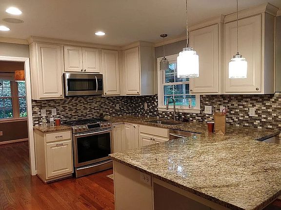 Home ideal for roommates is beautifully nestled on wooded lot in Woods of Kildaire neighborhood. Granite counter tops, New SS Appliances, Ceramic tile, wood cabinets, hardwood floors. Cozy family room with full masonry fireplace opens to large eat-in-kitchen. Screened porch with skylights overlooking the Garden. Deck and Paver patio. Fresh paint.