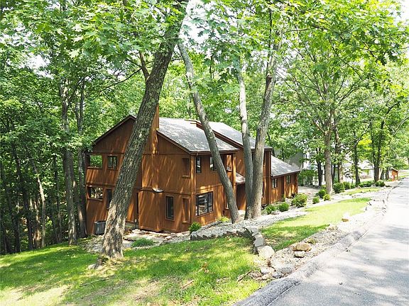 Serine & peaceful setting w/amazing interior. 4 bd, 4 bt home surrounded by rolling hills on wooded lot. Master suite has free-standing tub/shower, private balcony, two closets, dual sinks, sep toilet room & two add'l bdrm upstairs. Main floor has enormous modern kitchen, tons of storage, large walk-in pantry, breakfast bar, desk, solid countertops, access to screened in deck & open deck w/beautiful & private view of woods. Hearth room off kitchen has gas fireplace w/built-in bookshelves. Add'l woodburning fireplace in large living room & dining room off entry foyer. Beautiful and bright entry foyer with 2 skylights, newer front door, freshly painted, office or bedroom on main floor, updated powder room & main floor laundry. Lower level has 9' pour, full wet-bar for entertaining, fridge, full bath, gas fireplace, family room, access to a 3rd separate deck, huge storage room w/workshop. HVAC is zoned, new roof in 2020, snow removal, quick access to golf, restaurants, highways, etc.