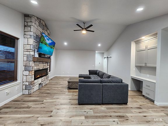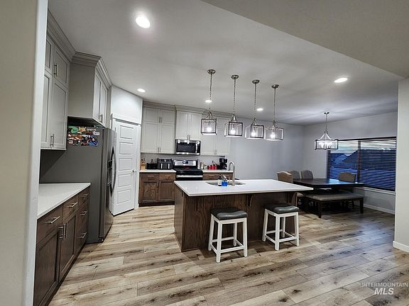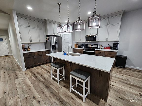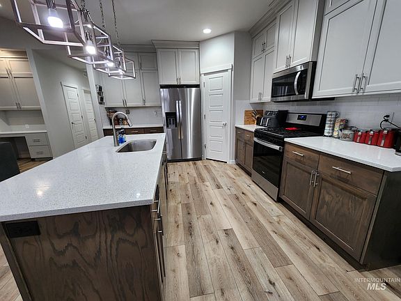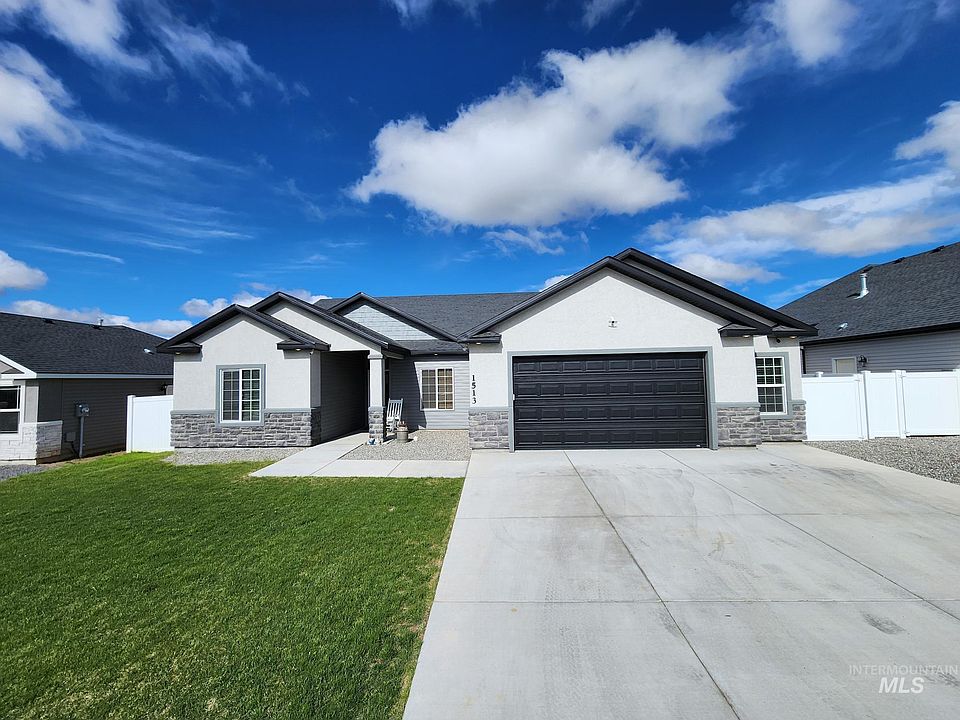 This newer construction home offers 1978 sq ft of living space, featuring 4 bedrooms and 2 bathrooms. The kitchen includes quartz countertops, two-tone cabinets, stainless steel appliances, and luxury vinyl plank flooring. The bedrooms have plush carpeting for added comfort. The great room boasts a vaulted ceiling and fireplace. The master suite comes with dual sink vanities, walk-in tile shower, soaker tub, and walk-in closet. Additional amenities include a mudroom with built-in bench and cabinets, large laundry room with a sink, and an oversized garage with dual water heaters. The covered patio overlooks the fully fenced backyard with established landscaping with fully automated sprinkler system. Located close to schools, this home combines the benefits of an established property with the perks of modern construction.