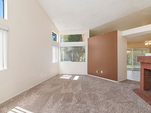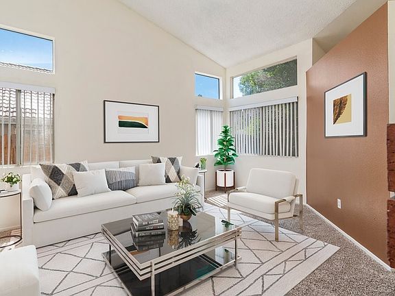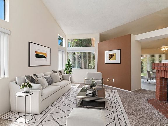 Check out this charming Single-story 2-bedroom home that features vaulted ceilings throughout, well appointed windows that bring in lots of natural light, a unique architectural interior design with wall niches and shelves for decorating and newer carpeting that gives a fresh clean feeling as you walk through the home. The sizable eat in kitchen has plenty of cabinetry, white appliances and a view of the backyard through an extra large newer sliding door. The spacious Primary Bedroom is well lit by several windows including new extra large sliding door and features an en suite bathroom, walk in closet and double vanity for added convenience. The second bedroom is generous in size as well and is close in proximity to the guest/hallway bathroom with a shower/tub combo. Located in a wonderful well-maintained neighborhood close to shopping and freeways, Low tax rate and No HOA make this the perfect home.