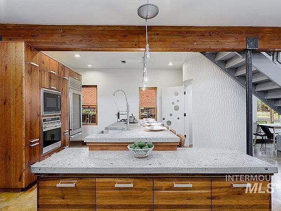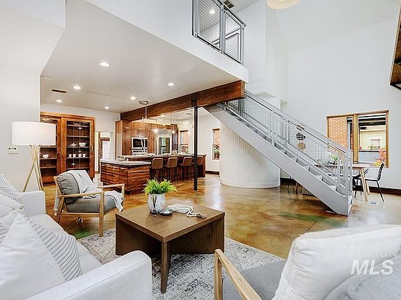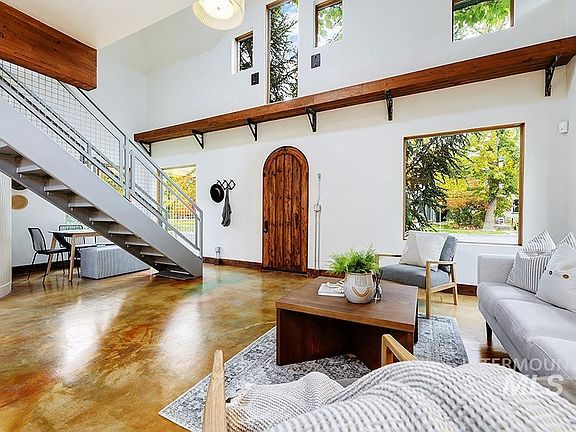 An authentic piece of Boise's history, brilliantly reimagined into a sleek loft-style residence in the North End! Built in the 1900s as one of the original 'ice houses', the striking double walled-brick facade pays homage to its roots, while the interior received a complete restoration-rebuild, fusing rich time-honored materials with postmodern design. Lofty double-story ceilings introduce the open floorplan, wrapped in soft hand-plastered walls that allow the artisan-crafted iron and wood detailing to come forth. Ample light and a wide open footprint make up the living quarters, while radiant-heated concrete floors span room to room. The gourmet kitchen is tucked behind a lengthy entertaining island, equipped with custom cherry cabinetry, concrete countertops, and state-of-the-art Wolf® and SubZero® appliances. Vaulted ceilings extend into the main-level primary retreat where a wall of floor-to-ceiling windows integrates the sleeping quarters into the private courtyard beyond.