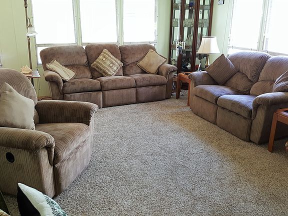 Welcome home to this beautiful 2 bedroom, 2 bath Bon Prix. This is a manufactured home in a park and NO land is involved with the sale of this home. This wonderful, immaculately maintained home offers approximately 1350 SF of room and its features include new carpeting & fresh paint throughout, large open living room area with entry closet and a bank of windows to bathe the room in light, built in china hutch in the dining room, large kitchen with glass top stove, side by side refrigerator, microwave and chest freezer, sliding door access from kitchen to side deck by carport, huge pantry area, large master bedroom features retreat/dressing area and walk in closet and also built in closet, along with sliding door access to private rear deck currently being used as an ultra swanky 'Catio' for a couple of special felines, master bath features walk in shower and guest bath features walk in shower. Living room measures approximately 21x13', dining room 8x9', pantry 9x3.5', master bedroom 16.5x11.5' plus 8x10' retreat/dressing area and 2nd bedroom 10x11'. Front deck measures approximately 12x10', front awning 10x20', master bedroom deck/Catio 6x20', carport side deck 34x4', side awning 34x5', carport 11x20', and storage buildings 6x11' and 6x8'. Lovely landscaped easy care yard. Washer & dryer stay. Air conditioning. Park rent is approximately $632 per month and includes water, sewer, garbage and recycling.