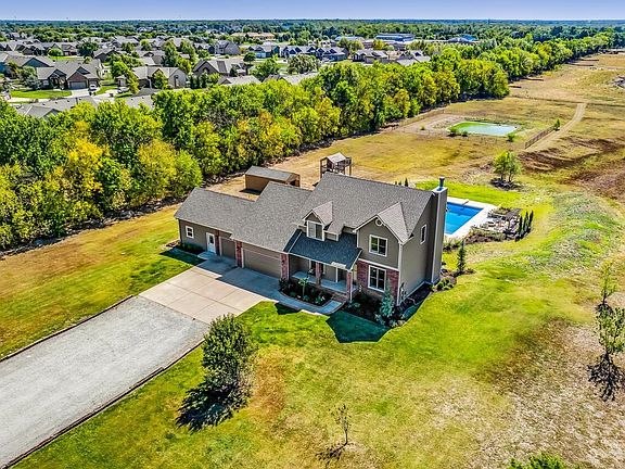 AMAZING...in Wichita, on acreage and in Andover schools...it doesn't get better than this!! Among 4.85 acres with tree row and a backyard dreamscape, sits a beautiful 5 bedroom 3.5 bath home with a mother-in-law suite! The covered front porch greets you upon entry and welcomes you into the heart of this home. The foyer is flanked by a living room to the right and a dining room with wood floors to the left. The spacious floor plan reveals a large family room area with a brick fireplace and a built-in surround and a door to the deck. Perfect for the cook in your home, this gourmet chef's kitchen has tons of cabinetry, abundant counter space, center island, pantry, granite countertops and an adjacent laundry room & a powder bath for guests. Upstairs, the relaxing master suite is complimented by a private bath with a tub, walk-in tile shower and a walk-in closet. 3 additional bedrooms and a full bath complete the upper level. This true walk-out basement proves great for additional living spaces including a rec room/theater room with projector & screen, bedroom, bath & an office. If you are looking for a great property you have found it!!!!! Land features an amazing heated in-ground saltwater pool with an undermount auto cover all new in 2021. The outdoors oasis also boasts a firepit, pergola with fountain, deck, a large building for pool storage, swing set & a covered patio. Don't miss the mother-in-law studio suite with a separate entrance! Located in Andover schools this home is not far from the convenience of city shopping! Don't miss out! New roof and exterior painting 2022. Court house has 2,550 for main floor that doesn't include the mother-in-law suite. Estimated sq. ft of studio is 400 sq. ft.
