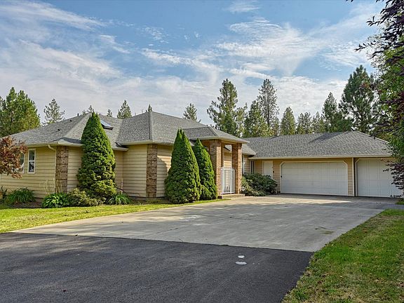 Peaceful living only 20 minutes from downtown Spokane and close to Fish Lake Regional Park. Check out this beautiful single level home, with no-step entry sitting on nearly 6 acres, with 24x24 shop w/220, 3-car insulated garage w/2-30 amp power and RV/boat parking. Mature landscaping with gazebo and shade trees, sprinklers, deck and covered patio. Open kitchen with eat-at bar, double ovens, gas range, trash compactor as well as a formal dining room. This 3 bed/3 bath home boasts wood floors, vinyl windows, skylights; bay window, large utility room, gas fireplace, wood stove. Primary bed has large tub, stand alone shower and walk-in closet. Not to be missed, priced to move quickly. Go see it today.