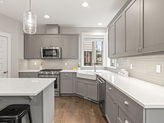 - Features: Builtin Range, Dishwasher, Gas Appliances, Island, Kitchen Dining Room Combo, Microwave, Free Standing Refrigerator, Quartz, Wood Floors
