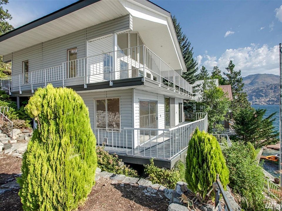 80' of Lake Chelan WATERFRONT. Spectacular home. Three tier deck with unbelievable lake and mountain views. Your very own private dock. Recent updates include new roof, low maintenance exterior siding, newly textured and painted interior, lighting fixtures and more. Vaulted ceilings on main floor give home bright and airy feel. Enjoy the recreational opportunities right out your back door, entertain, or simply decompress while soaking in the surrounding beauty.
