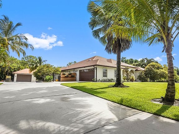Spectacular Single Family Pool Home with detached 4 car garage in The Acreage, Loxahatchee, FLWelcome to your dream home in the desirable non-HOA community of The Acreage in Loxahatchee, FL! This stunning single-story pool residence offers 5 bedrooms, 3 updated bathrooms, outside kitchen, a rare 4-car garage, providing ample space for all your needs, FULL HOME GENERATOR and a NEW ROOF. As you approach, the inviting front porch sets the tone for this charming home. Step inside the foyer, where you'll find the dining room to your left and the living room straight ahead, creating a warm and welcoming entrance. The home is also complete with Lutron light controls, Lutron electric shades, and high-end speakers in the living room and pool area. The kitchen is a chef's delight, featuring beautiful marble countertops, upgraded cabinets, and a perfect view of the family room, covered lanai, and pool.