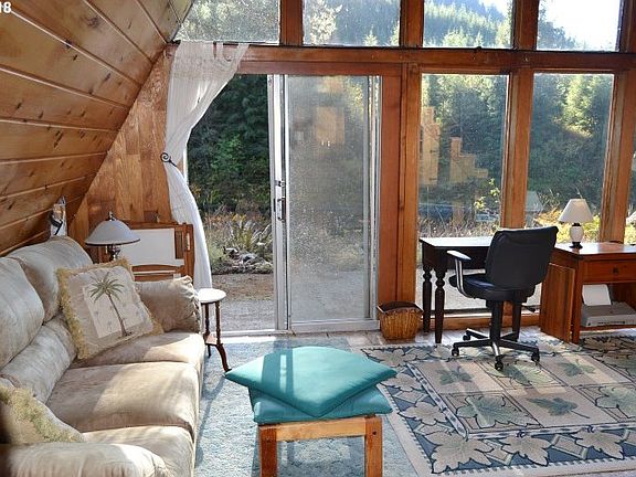 Step out your back door to prime fishing on the Wilson River! This unique A-frame sits on .70 acres with beautiful views and river frontage. Lovely landscaped property with a peaceful, private setting. Light and bright home with tons of windows and a cozy woodstove. Carport and shed included for extra storage. The cabin is completely furnished and ready to enjoy your vacation getaway. Owner will carry!