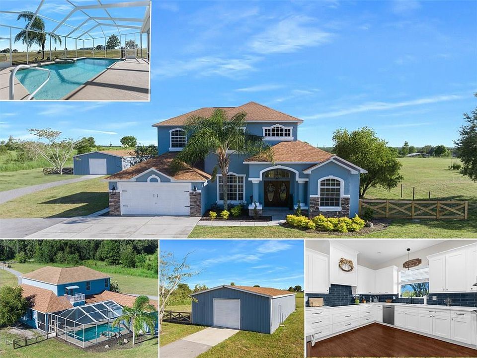 THIS ONE HAS IT ALL!! HUGE 5 bedroom, 3.5 bath, 2-story DREAM HOME with HUGE REMODELED KITCHEN and MASTER BATH to envy + gas fireplace + private pool (saltwater and heated) + heated spa + PLUS large detached metal garage sitting high on 4.7 fenced and gated acres on a hilltop with stunning views!! Recently remodeled and upgraded! Farm-style crossed with modern design - made for the pages of a magazine! 5 bedrooms + game/media room + 3.5 bathrooms + 2 car attached garage + 30 x 40 detached garage + dinning room + breakfast nook + great room downstairs + loft living room upstairs with balcony! The home offers 3,306 sq ft of living space; 4,154 total sq ft PLUS the large detached garage! From the upstairs loft, walk through the glass french doors out onto the balcony and be wowed by the views as far as your eyes can see! This home is impressive from the minute you pull up to the board-fenced, electric-gated entrance! Wind up the paved driveway to the home as you view the grand entrance, gorgeous green yard, impressive detached building (everyone wants) and oversized paved/concrete driveway to fit all your cars and toys! Your guests will enter the home into the foyer with double-height, soaring ceilings, and beautiful open staircase leading to the loft living room and 3 bedrooms and full bathroom upstairs! The recently remodeled modern farm kitchen has high-end upgraded finishes and it's huge at 20x16! Expansive Quartz countertops with large breakfast bar! New real wood, white shaker cabinets! Designer subway tile backsplash! All new stainless steel appliances: induction cooktop, built-in double convection ovens, built-in new style microwave drawer. Designer farm-style lighting and plumbing fixtures! Just perfect and open to the large family room and dinette area to give a sense of a large open space! This new open floor plan with the gorgeous wood beam ceiling and the high ceilings...makes this home feel light, bright, spacious, happy, and comfortable! Large living room (19x18) with glass sliders overlooking the outdoor living space and pool! Enjoy family days and entertaining outside on your large covered, screened-in lanai and in your inviting pool and hot tub! Master suite with master bathroom are down stairs and have privacy from the other bedroom downstairs with the home's split floor plan. The master has two large walk-in closets, duals sinks with new granite countertops and real wood cabinets! Modern soaker tub with pedestal faucet! Large walk-in ceramic-tiled shower! Feel like you're at the spa everyday! The media/game room and additional bedroom and bathrooms are on the opposite side of the home. The half pool bath for your family and guests has been remodeled to match the kitchen with Quartz countertop and real wood shaker cabinets! Lots of closet space in this home! Located 1 hour from Tampa and 2 TOP US Beaches! 30 minutes to sunsets at Pine Island, fishing and boating off Hernando Beach! Near Weeki Wachee State Park for kayaking down the crystal clear river, Buccaneer Bay Water Park, swimming with the manatees! Come see this beauty...it truly offers EVERYTHING!! Foundation stabilized. All engineer's reports are available. Fully insurable and financeable. NO FLOOD. NO HOA.