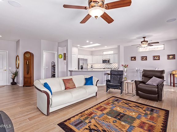 Beautifully updated Acacia model home, showcasing modern upgrades throughout. Features include stylish wood-look flooring, sleek quartz countertops, a custom backsplash, and stainless steel appliances. Updated lighting and ceiling fans add to the contemporary charm. Step outside to your back patio and take in the serene desert views. Experience the resort-style living of Sun City Grand, offering world-class amenities such as golf courses, fitness centers, pools, spas, and an array of clubs and activities. This home is the perfect blend of comfort and lifestyle—welcome to your new oasis in Sun City Grand!