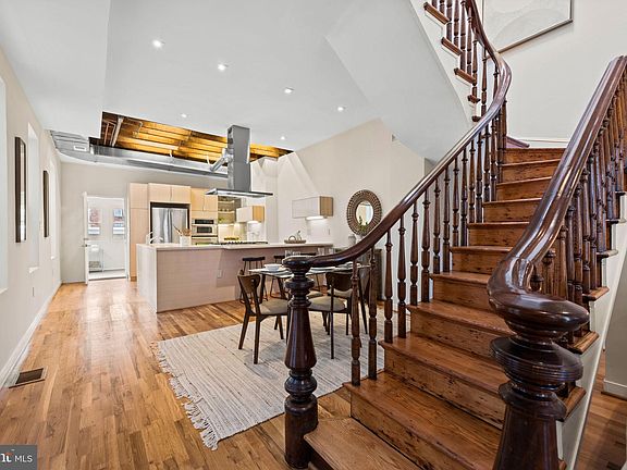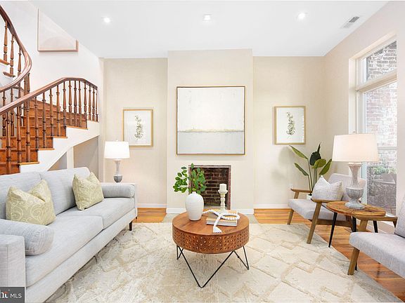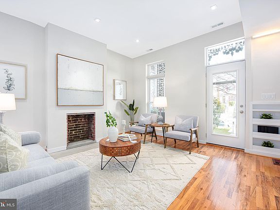 This storybook brick semi-detached home is set back with a gracious front yard/garden, covered front porch, sited on a 2,100 square foot lot, 17’ wide, with a 2 car garage backing to an alley, which begs for an addition or a carriage house, all for the price of a condo! The main level open floating side staircase is mesmerizing with the beautiful wide wood banister & balusters and an airy feel with 10’ ceilings, recessed lighting, large windows, refinished floors and fresh paint. The relaxing open renovated kitchen with plentiful full height cabinets, stainless-steel appliances with a 5-burner gas cooktop and floating range hood, and an extended Corian breakfast top is made for entertaining. The upper primary bedroom is huge, made for a king size bed, bathed in sunlight with large windows & skylight and a large 12’ wide closet with sliding doors. The two bedrooms are separated front to back by the staircase and a full renovated tiled bathroom with wide vanity with two faucets and top. The back main level mudroom/laundry room has a washer and dryer, a half bath and access to the garage. Newer maintenance free siding, newer windows, newer HVAC and a parking garage make this attractive home appealing to those looking for a condo alternative. Enjoy an enclosed entertaining area in the rear is perfect for cook outs and firepits. Located walking distance to 3 supermarkets, plus coffeeshops bars and restaurants, several metros and only 5 blocks to Logan Circle.