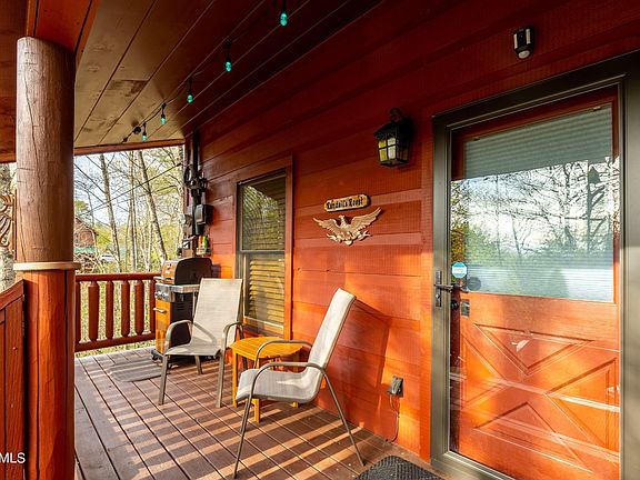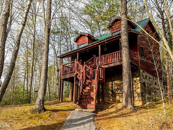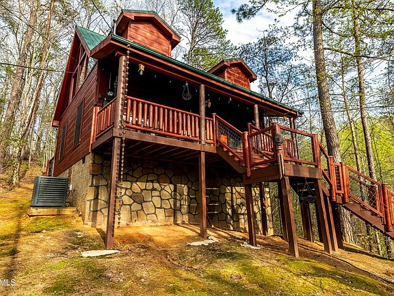 Great opportunity to acquire your own hideaway in the mountains! Right next to Gatlinburg & Pigeon Forge attractions, yet peacefully nestled in the wooded hills of popular Sky Harbor! Must see the rustic charm and warmth of this natural abode with its wood floors, walls, and hand-carved wood railed staircase accessing upper half story loft! Stone fireplace! See woods and nature out your many picture windows, and even an occasional bear or 2! Big bedroom on main level featuring an in-room whirlpool tub! Natural wood throughout! Perfect for your second home or excellent rental investment next to the most visited national park! This special cabin comes fully furnished, with beds, furniture, TV's and more! Covered front porch for your rockers or swing, plus nice private deck in back.