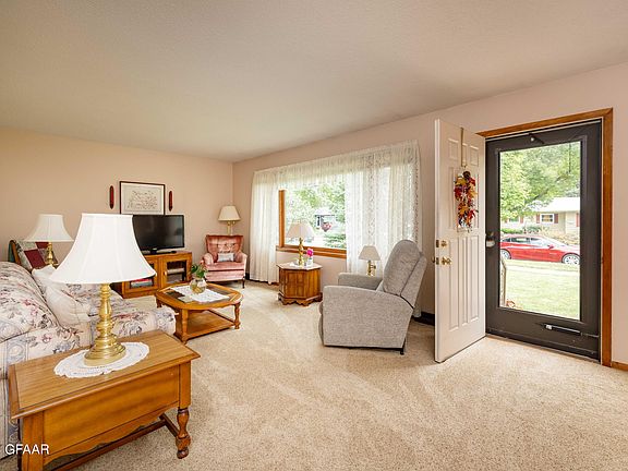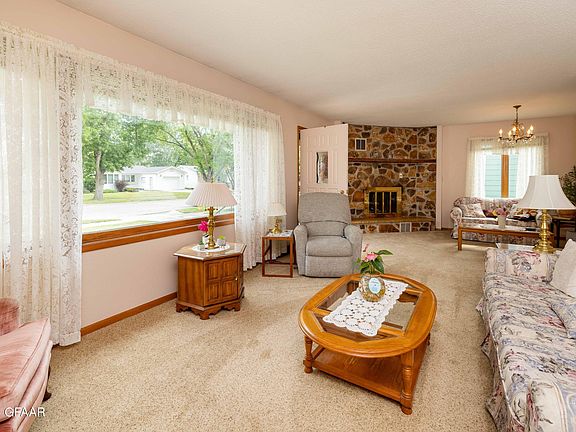 Beautiful ranch style home in desirable South Grand Forks location convenient to schools, hospital, and everything Grand Forks. This home has been well taken care of with brand new carpet on the main floor, AC unit in 2023, furnace in 2018, and shingles in 2016. Main floor features a large living room, sitting area with wood fireplace, kitchen open to big dining space, full bath and 2 good sized bedrooms. Basement is finished with family room, huge bedroom, 3/4 bath, and utility/storage area. This home checks all the boxes with an extra large 2 car garage, cute backyard with deck, and forced air heating and cooling. Check it out before it's too late!