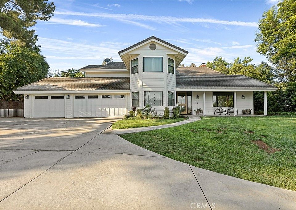 Stunning Modern Farmhouse! This home sits high up a long driveway on 3/4 of an acre. Over 3,300 square foot home with 5 bedrooms and 3 bathrooms. Enter through a custom maple and glass front door into a light and bright space. Large living room with vaulted ceiling and pass-through bar with custom cabinetry and soapstone counters to the family room with cozy white brick fireplace and designer details is all open to the gourmet kitchen and large eat-in area. Kitchen has custom cabinets with stainless appliances, soapstone counters on kitchen perimeter and buffet plus a large island with counter seating and Calacatta marble. Walk-in pantry and stunning custom built laundry and mudroom. One bedroom and gorgeous bath with Quartz counters and rich dark tiled shower downstairs. Upstairs has 3 good size bedrooms plus a bath with double sinks and designer details plus a large primary suite with vaulted ceilings and view of the rear yard. Primary bathroom is a real retreat with standalone tub and gorgeous shower all with Carrara marble and built-in vanity. Rear covered patio and pool area plus flat grassy yard and another large covered entertaining space. Newly painted inside, all new carpet, beautiful European oak wood floors, newer windows and doors!