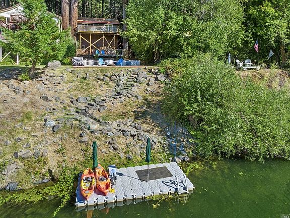 Nestled in the Redwoods rests this sweet riverfront jewel. Sit in the sunshine and take in the Russian River views. Walk the stone pathway to your own private dock and launch your kayak out into the heart of Guerneville - this is where memories are made! This 2bd/1bth home has been thoughtfully remodeled with style & an artful attention to detail. Its sophisticated kitchen flows fluidly through the living room and outside onto the deck, beautiful tile work embellishes the kitchen and bath, and rich wood doors accent the entryways. The custom living room cabinets are set up to accommodate any work from home needs, internet service is plentiful. Ductless heat & air conditioning options give you easy control of your environment - new windows, doors, flooring, and insulation make it so you rarely need either. Large garage w/ generator hookup. Easy access to everything west Sonoma County, wine country, and the stunning Pacific Ocean. Russian River dream come true!