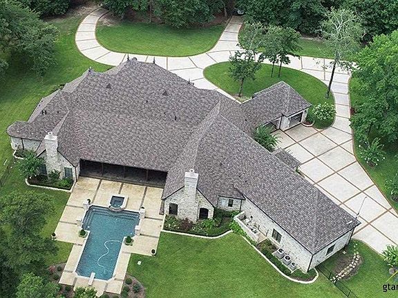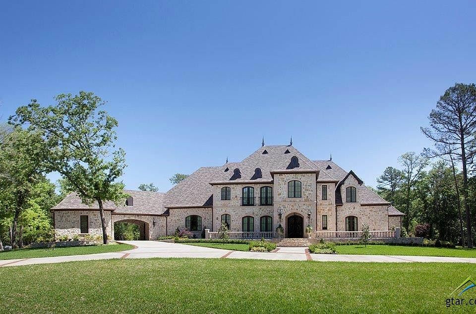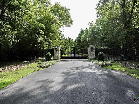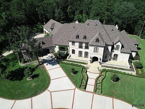 Custom-designed & built; this masterpiece was constructed in 2015 w/amazing quality features, extensive millwork & built-ins throughout. The solid Granbury Stone exterior, lge Sandstone cov'd front porch, mansard roof line, copper finials, gutters, downpipes & dormer windows are all distinctive of this French manor home. Wide tree-lined driveway leads to impressive gated entry w/stone columns, wrought iron gate & fencing. Secluded from main roads view by dense thicket of trees; so peaceful & quiet! Emerging from the woods, one sees the 2-story stately home w/scored concrete circular driveway. Magnificent estate-type home; meticulous attention to every detail. Features 3 living areas, including study, + media rm, complete w/kitchenette. A grand entry hall, accented by winding custom wrought iron staircase, opens to the formal dining room & formal living room. Kitchen w/island, prep sink, Sub-Zero refrigerator, icemaker, 2 dishwashers, 3 ovens including Wolf range/oven, granite countertops & vent-a-hood of hand-painted cast stone. Separate room off kitchen w/extensive custom cabinetry for storage & lge pantry; includes a baking center with out-of-site storage for small appliances. Separate butlers pantry w/Sonic icemaker, sink, coffee station, china/crystal cabinets & custom-designed wine room. Lge outdoor living & dining area w/stone fireplace, TV over mantle, complete kitchen including SS grill, refrigerator, icemaker & DW, full tile bath & heated gunite pool/spa w/water features. Custom wrought iron backyard fencing. Adjoining covered porch spans back of home; great entertaining area! Concrete drive leads to separate 40X60 shop w/guest house/office featuring workout area, full bath, kitchenette w/antique bar & cabinets; stairs to add'l storage. On apx. 70 wooded ac., across road fm LK. Tyler, access to public boat ramp & private docks just min. away. Buyer could divide land into pastures or subdivide & sell tracts. No restrictions.