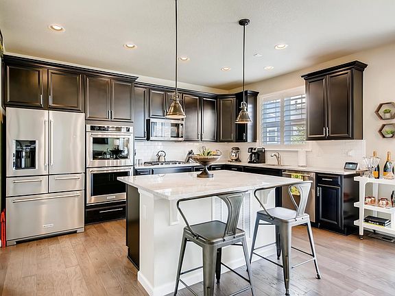 Better than new, this gorgeous home from Meritage is move in ready. Almost 2200 square feet plus a full basement to expand if you want more. Built in 2016, this 3 bedroom/3 bath plus study home with upgrades galore will not disappoint. A kitchen perfect for entertaining with a huge island, granite counters, double oven, and top of the line KitchenAid stainless appliances. No detail overlooked: stacked stone fireplace, newly updated light fixtures, warm wood flooring, iron stair railings and plantation shutters. Upstairs laundry. The opulence continues in the back yard with 35K of professional landscaping including an extensive stamped concrete patio. Excellent Douglas County Schools, great central location near Lincoln and Chambers in Sierra Ridge. Community pool and clubhouse. Don't wait; priced at a great value.