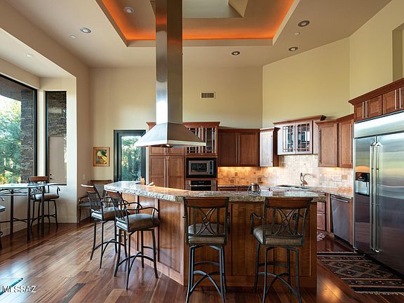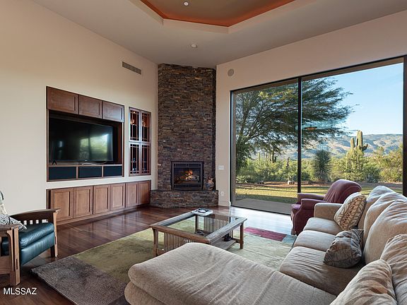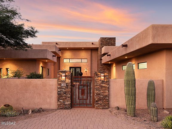 * Tastefully appointed Frank Lloyd Wright inspired 3,736sf 3BR/4BA home nestled at the end of private cul-de-sac in gated Coyote Creek. A gated courtyard entry accented by a modern art water feature provides a tranquil setting for this masterpiece. A spacious great room w/soaring 15' ceilings accented w/lighted, stacked stone fireplace & wall of windows that draw your eyes to the majestic valley & mountain views. Custom bar area w/chisel edge granite counter, sink & wine fridge make the perfect area for entertaining. Gourmet kitchen hosts a spacious island, 55'' Dacor & Viking gas cooktop w/grill. Casual & formal dining areas. Brazilian wood & slate flooring w/metal medallion accents, distinctive designer lighting. Master suite has stacked stone fireplace & glass doors to patio.