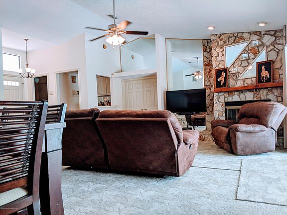 - Blinds, Breakfast Bar, Open Floor Plan, Walk-in Closet(s), Fireplace-Wood, Ceiling-Vaulted, Counters-Tile