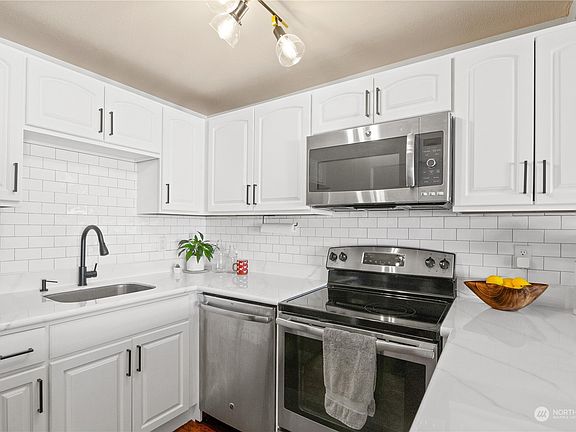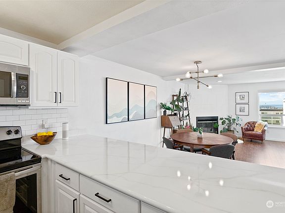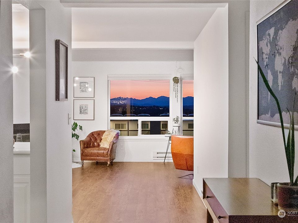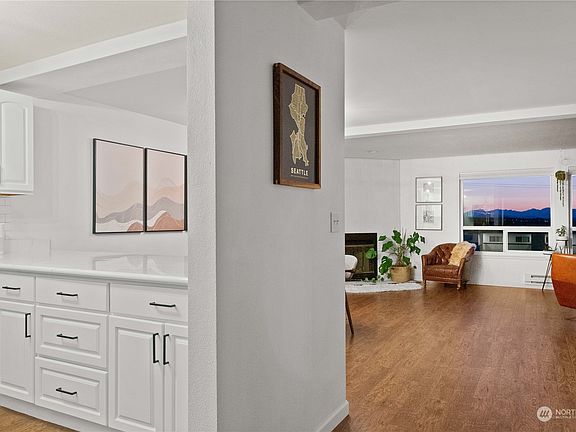 Feel the cozy wood-burning fireplace while basking in sunset glows silhouetted against the visible Olympic mountaintops! Light-filled, ultra-spacious corner end unit w/ gorgeous views of the Olympic mountains, stadium fireworks, downtown skyscrapers, peekaboo Puget Sound waters + Space Needle. Open concept living/dining, updated kitchen+baths, off-street indoor garage parking space (rare!), guest parking, laundry room, patio, storage unit, shared rec room. Desirable location: minutes drive access to I-5, I-90, bus lines 36 + 60; walk to International District, SODO, stadiums, neighborhood parks. Friendly, respectful HOA community, no rental cap, low dues, exterior/deck renovation upcoming. A must-see, unique gem in the city.