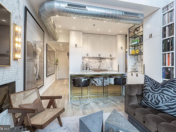 Imagine life as it was meant to be lived; in style. Wake each morning perched over the beating heart of the District, the morning light invigorating your routine as it pours in through two-story, floor to ceiling windows. Enjoy breakfast served on a natural work of art, letting your eye follow the veining of rare marble with subtle and surprising accents of brown and blue. Any meal is a joy to prepare on the bespoke island, where the marble cascades to the floor, framing rich brass paneling on one side and chef inspired stainless steel cabinets and drawers on the other. Professional grade Wolf and Subzero appliances are sure to inspire even the amateur cook to create gourmet masterpieces. Geometrically textured marble slabs and complementary curtains grace the living room, drawing your eye upward to a Restoration Hardware chandelier in polished chrome, with sophisticated-industrial sensibilities. Relax in front of the TV, with custom brass frame, or embrace modern hygge with the ambient electric fireplace. When you're feeling productive, a built-in desk, in the same rare marble as the kitchen, maintains a low visual profile, with plenty of room to spread out. As productivity wanes, survey the neighborhood and passers-by from the gazing balcony, while you soak up the sun.