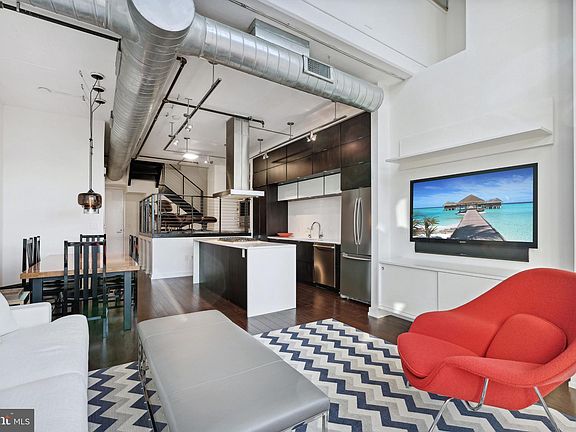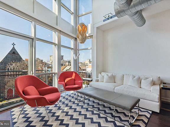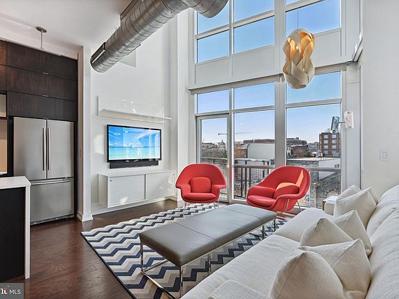Superlatives apply, including this new price! Exceptional two-level residence in a vibrant Logan Circle location, with grocery stores, shops, pubs, restaurants and fitness center close by for the ultimate in-town lifestyle. This west-facing duplex offers dramatic soaring ceilings and windows (with automated shades) in the living area, with dynamic views of historic buildings and the bustling neighborhood. You can even see the Washington Monument from the Juliet balcony. Generous kitchen island is a place to gather when you're not enjoying the cozy den with gas fireplace and built-ins. On the upper level, there are two generous bedrooms with en suite baths and custom walk-in closets. The primary bath features abundant storage, double sinks, a generous shower where natural light streams through frosted glass, as well as full-size washer and dryer. Acoustic windows in the guest bedroom assure privacy. One on-site garage parking space (PS-151) plus two private storage rooms (not bins) (P312 & P407) convey. The Metropole offers a stylish lobby with concierge services plus two guest suites that residents may reserve.