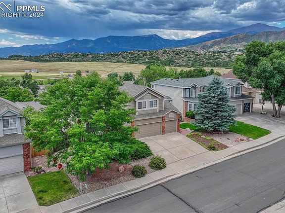 Pikes Peak and Front Range views abound from this 5BD|4BA|3CAR 2-story with finished walk-out basement near Ute Valley Park. Enter from the covered porch to a welcoming foyer, abundant natural light and a formal living area. Make your way through the formal dining space with bay window to the great room and kitchen featuring stunning views and walk-out to a 19ft x 12ft composite deck. Take a moment here to savor the views! The eat-in kitchen boasts LG and Bosch S/S appliances, range with double oven, slab granite countertops, counter bar, vaulted ceiling and pantry. Refrigerator included! The great room features a gas fireplace, vaulted ceiling, ceiling fan, built-in shelves and 2 large windows showcasing fantastic views. A powder room and laundry/mud room with cabinetry, sink, window, tile floor and garage access complete the main level. Upstairs you will find the primary suite with vaulted ceiling and adjoining 5-piece bath with Pikes Peak views, jetted tub and walk-in closet. Three additional bedrooms, all with built-in closet shelving, and a full bath with double vanity complete the upper level. The finished basement, which could serve as a separate living space from the occupants above, features a 39ft x 14ft family room with walk-out to the backyard, is pre-plumbed for a wet bar and has two large above grade windows. It A 5th bedroom with two closets and a full bath with adjoining storage space round out the basement level. Note the functionality of this Academy School District location with hiking and biking trails, parks, outdoor activities, Garden of the Gods, Pike National Forest and I-25 easily accessible.