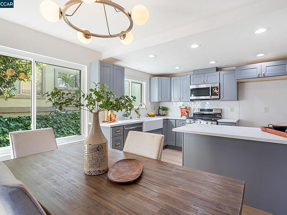 Gorgeous 3 bedroom home with tons of light and style! Just move in and enjoy a beautifully updated home in a wonderful community of Pinole. New wood laminate flooring, dream kitchen with new cabinets, on trend white farm sink, spacious pantry area, new stainless steel appliances, and timeless quartz counters. Freshly painted interior, dual pane windows, plantation shutters, new designer light fixtures, remodeled bathrooms with new vanities and tile details, plus spacious primary and guest bedrooms. Bonus room off of 3rd guest room could work as office, flex space, or kids bedroom area, etc. Vaulted ceilings create an airy feel and lets tons of light in the dining and entertaining areas, plus chic and fun wet bar in living room. Private deck off kitchen, interior laundry room, central heat and A/C, plus attached 2 car garage. Enjoy community amenities including a pool and playground. Private deck with forest views. All of this nestled in a ideal location, close to schools, shopping, freeways, and more!