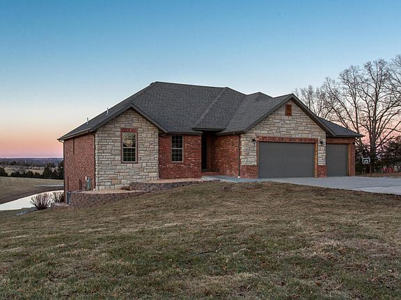 Ozark Schools! All brick walkout basement on 5 acres with one acre lake! Lake has been stocked by conservation department. Open concept plan offers large dining area, covered deck, extensive use of hardwood flooring, stainless appliances, convection wall oven, built in microwave, granite counters throughout, center island and separate pantry. Master has large walk-in closet, tiled walk-in shower, and his/her vanity. Basement has two additional bedrooms, wet bar and John Deere Room. Don't miss the 50x50ft sport court! Estimated completion 03/01.